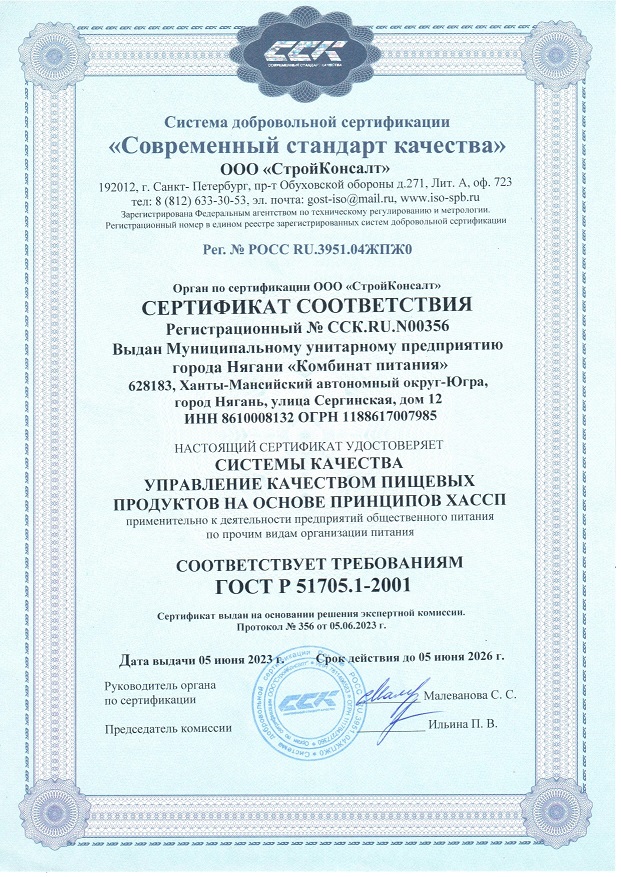 МУП г.Нягани «Комбинат питания» имеет положительный, многолетний опыт оказания услуг организации питания обучающихся не менее 8 000 человек в день, является единственным предприятием, оказывающим услуги по организации питания детей во всех общеобразовательных учреждениях города Нягани. Питание осуществляется в соответствии с программой производственного контроля, выпускаемая продукция (полуфабрикаты, пироги и пр.) имеет декларации соответствия.